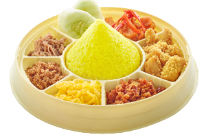 Tumpeng nasi kuning dengan varian lauk seperti ayam goreng, sambal goreng kentang, tempe bacem, telur dadar tipis, perkedel, sayur urapan, lalapan, sambal, cocok untuk 15 orang.Tambah ke keranjang