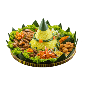 Tumpeng nasi kuning dengan varian lauk seperti ayam goreng, sambal goreng kentang, tempe bacem, telur dadar tipis, perkedel, sayur urapan, lalapan, sambal, cocok untuk 25 orang.Tambah ke keranjang